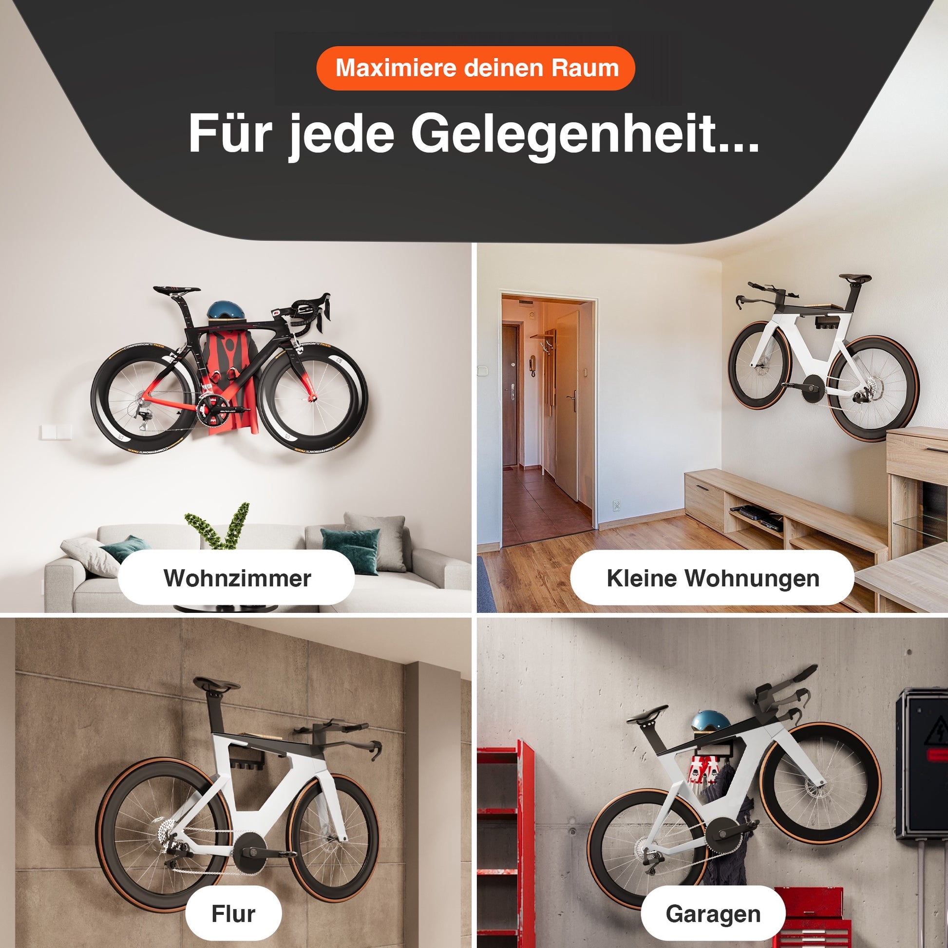 Alle Triathlon-, Renn- und Gravelbikes – bis zu einer Lenkerbreite von 48 cm. Egal ob Aero-Maschine oder Allroad-Bike: Deine Lieblingsausrüstung hat jetzt ihren Platz an der Wand.